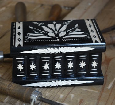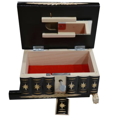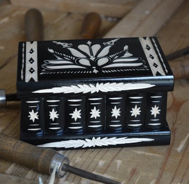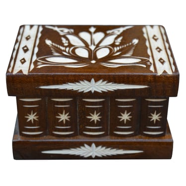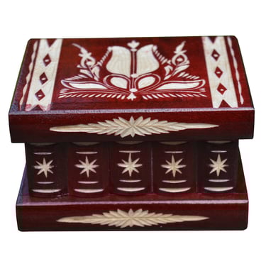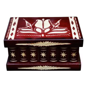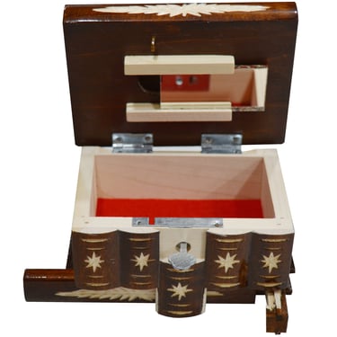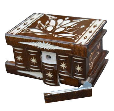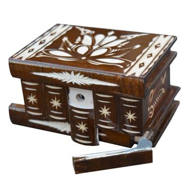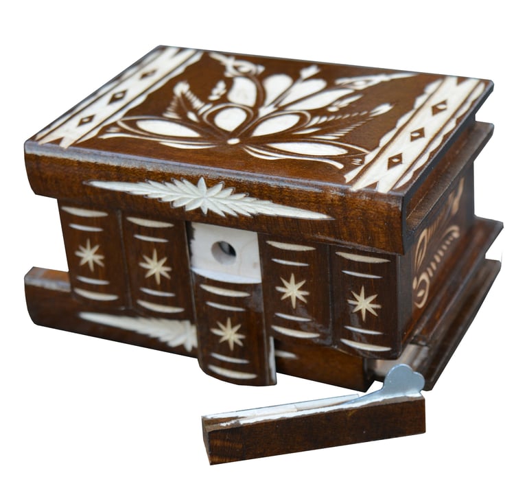 Discover a world of mystery and craftsmanship with this beautifully hand carved wooden puzzle box! Expertly crafted, this handmade box features multiple secret compartments and a mirror inside