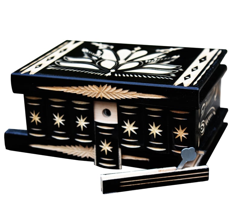 Challenge yourself (or your friends!) to unlock the box’s clever hidden spaces, perfect for storing jewelry, small treasures, secret notes or even as escape room game.
